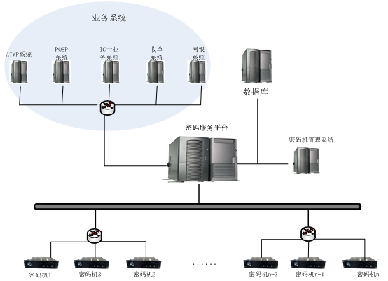集中式部署方式,主要是针对复杂的银行交易系统而采用的部署方式,即多台密码机共同为多个应用系统提供密码服务。一方面,目前银行的业务种类繁多,如网上银行、移动支付、银行卡业务、理财业务等等。另一方面,此款密码机性能高、功能强,可以同时为多个应用系统提供密码服务。因此可以采用多机-多应用方式进行部署,以达到资源共享,降低成本,同时提高密码机利用效率和提高系统可用性的目的。 |